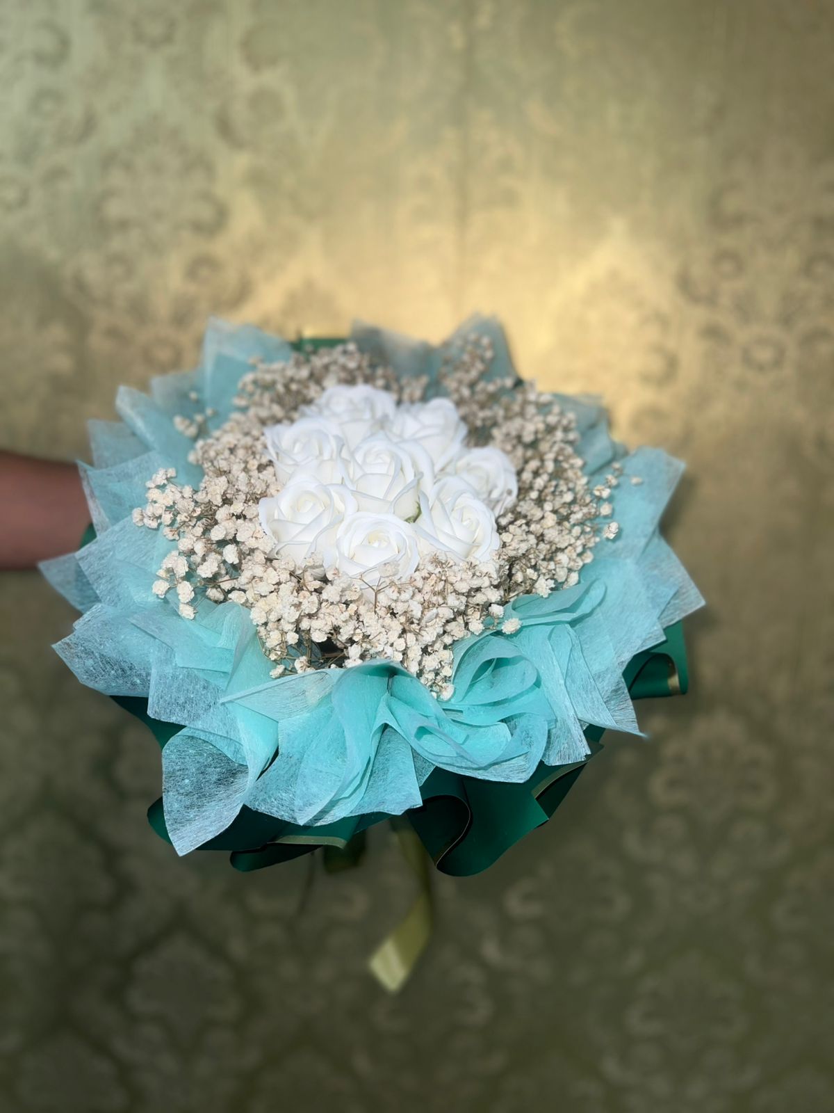 light blue wrapping with baby breath